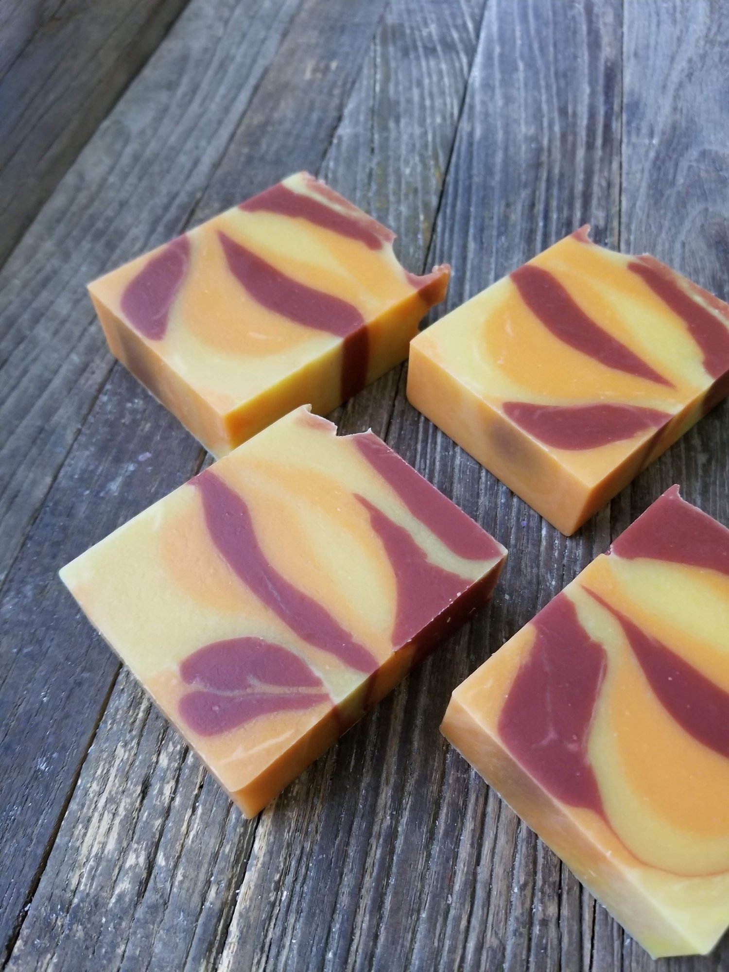 Another fan fave that many wait for in the Fall release. This soap smells oak-y with a spicy twist (cinnamon) and is the scent of Fall. The colours chosen are also reminiscent of Fall...lots of orange, red and yellows and are just so pretty....